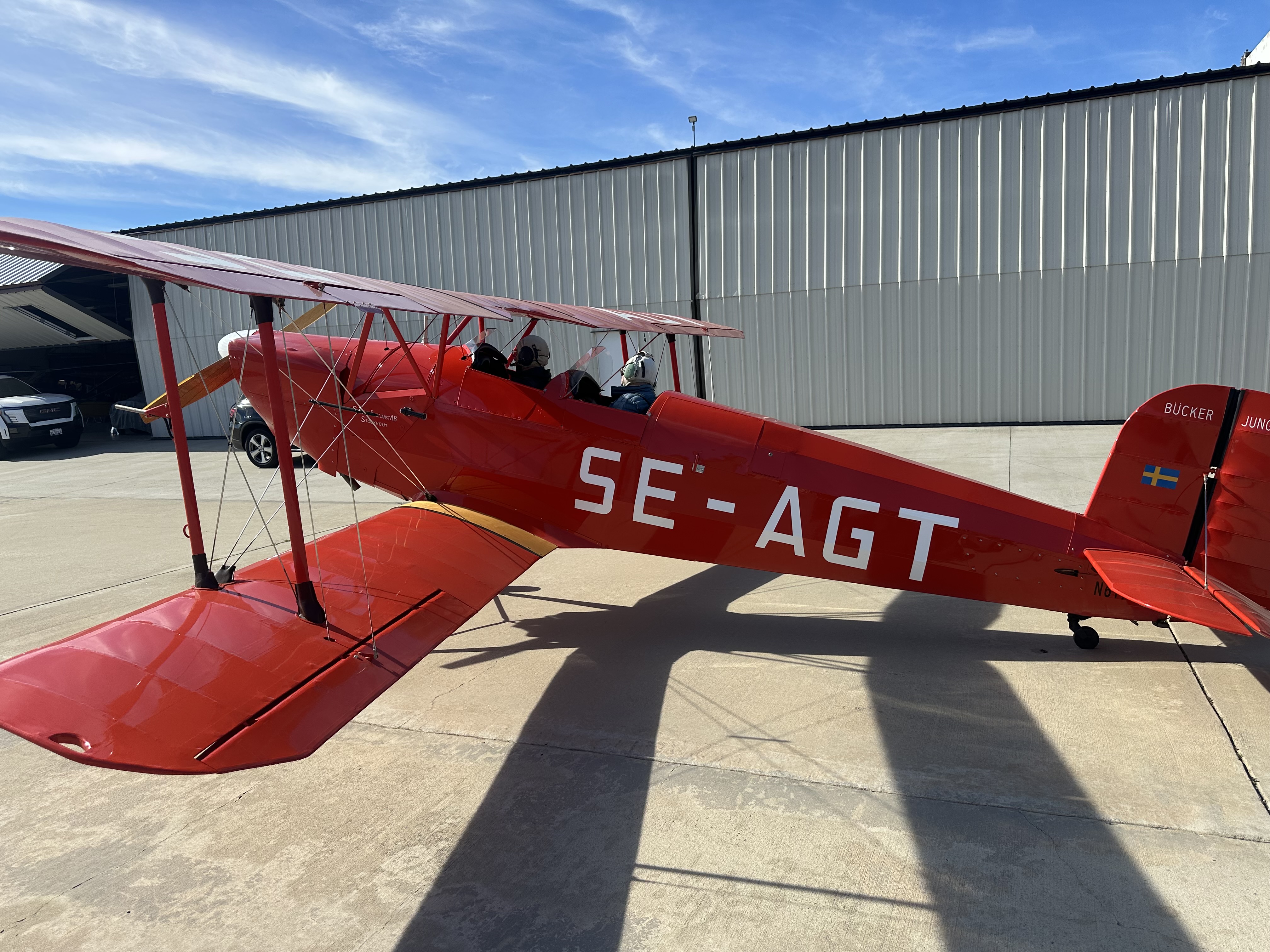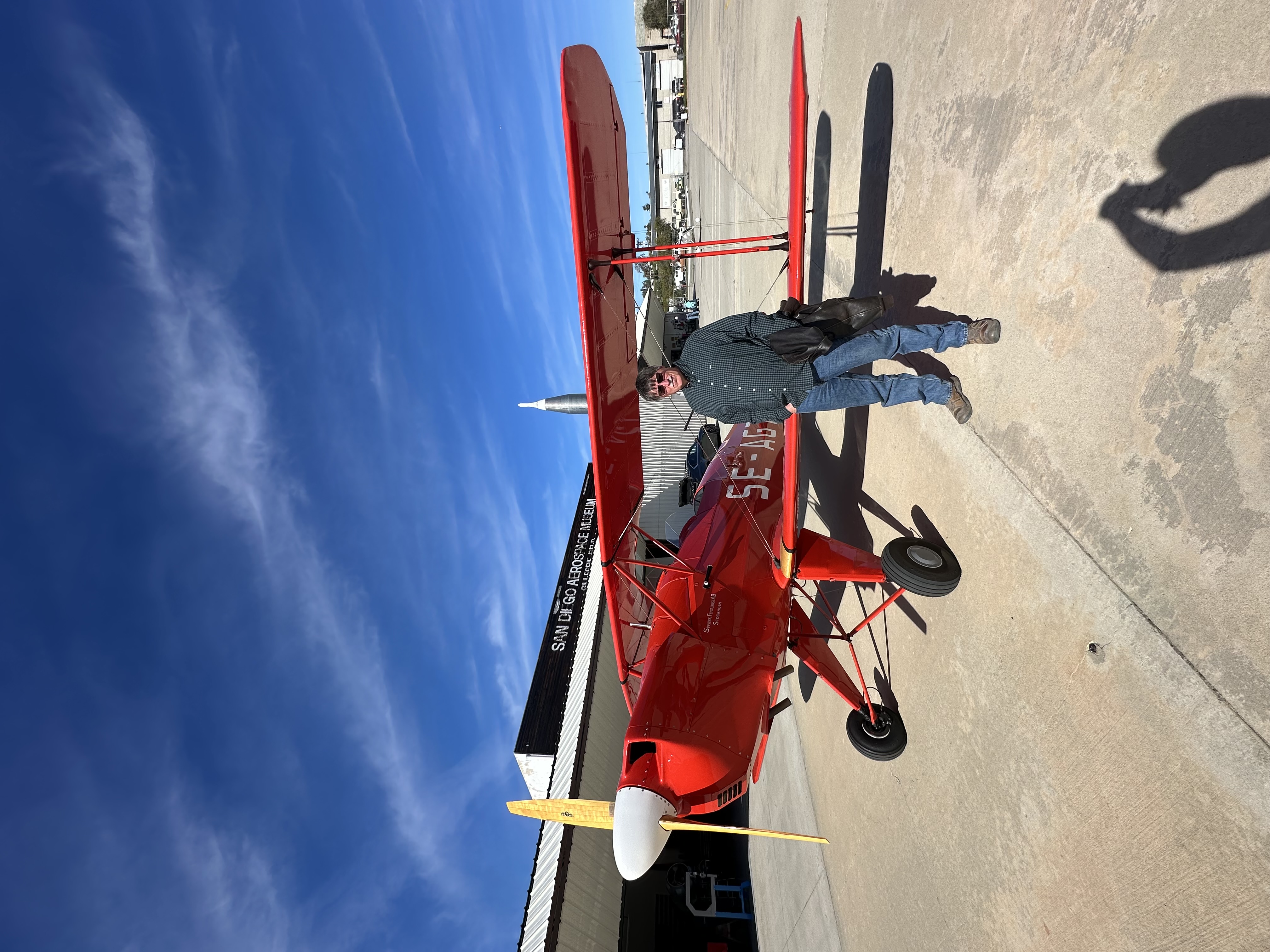 John Collins gave Brent the "Tour de Gillespie" on Saturday afternoon, making stops at his hangar to see his Fairchild and PT-13 and no trip would be complete without a stop at the Bucker Kingdom at Classics Hangars. Â John Hickman, Chris Overson and Wheeler North et al, loaded Brent in one of their pristine Bucker biplanes (this one a Jungmann) for a scenic flight around San Diego and then followed that up with a visit to Allen Airways Museum where Bill met him to tour the facility. Several of our members, including Bill and John Hickman, have known Brent and his father Robert Taylor for many years and have visited the Taylors in Blakesburg. Â No doubt, our team of AAASDC "ambassadors" were appreciated by Brent during his brief stay in San Diego!